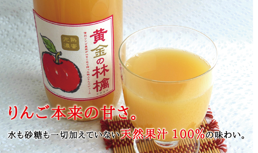 黄金の林檎ジュースは、りんごを搾って作られるストレート果汁です。濃縮還元タイプでないので、ジュースの元になる水分も全てりんごそのままです。砂糖や甘味料を加えていない天然の甘さをぜひ、味わってみてください。